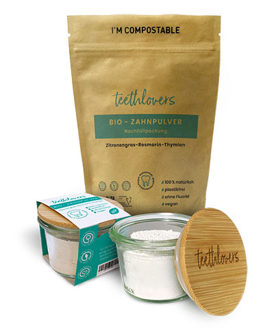 Mit teethlovers führen wir ein gemeinwohlorientiertes Unternehmen, welches zum Einen für natürliche Zahnpflege und spürbar saubere Zähne sorgt - und zwar mit unserem Bio-Zahnpulver für die tägliche Zahnreinigung. Und zum Anderen durch nachhaltiges Unternehmer:innentum Mehrwert schafft für Mensch und Umwelt.