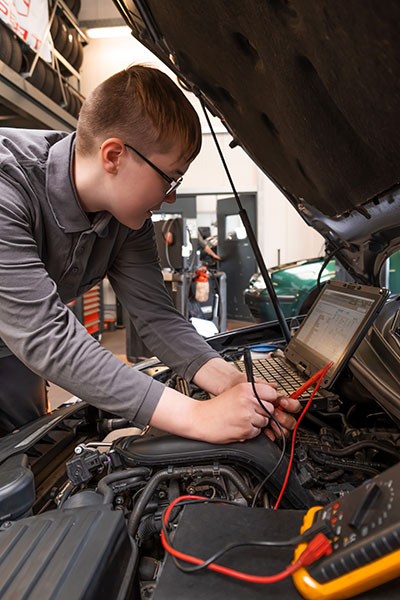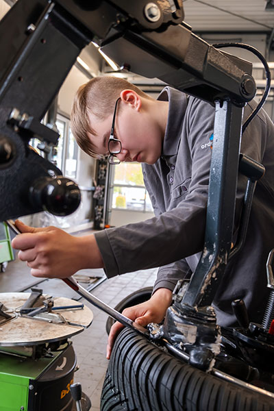Das Spannende an dem Beruf ist seine Vielfalt, mal ein Räderwechsel, mal eine Achsvermessung, Leitungen werden durchgeprüft und Schaltpläne rausgesucht. Genau so hatte ich mir das auch vorgestellt. Man arbeitet mit modernen Diagnosegeräten und mit dem PC, die Software liest Fehler aus und Werte ab und leitet einen durch die nächsten Arbeitsschritte. Anhand des Fehlerspeichers weiß man dann, in welche Richtung die Reparatur geht. Auch die Abgasuntersuchung läuft heute digital. Man muss sich ständig weiterbilden und weiterentwickeln und besucht dazu Lehrgänge. In der Berufsschule lernen wir auch entsprechende PC-Programme und Diagnosetools kennen. Man braucht schon auch handwerkliches Geschick und Muskelkraft, weil man ja auch anpacken muss, z.B. beim Räderwechsel müssen Reifen aus dem oberen Regal runtergeholt oder Getriebe rausgehoben werden. Aber da helfen auch die Kollegen. Mich hat es immer interessiert und ich wollte es selbst machen, das traut man mir hier auch zu. Wenn Fragen sind, kann ich mich immer an meine Ausbilder und Kollegen wenden. Es macht mir riesigen Spaß.